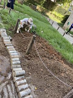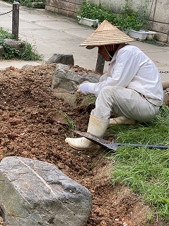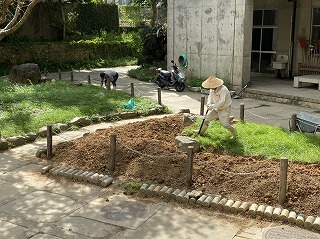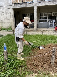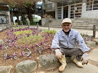 本校環境ボランティアの上江洲さんが体育館前の三角花壇を整備してくださっています!