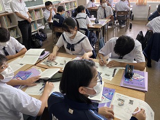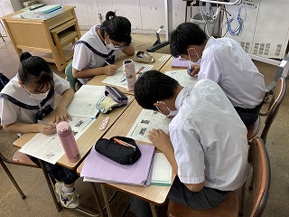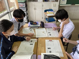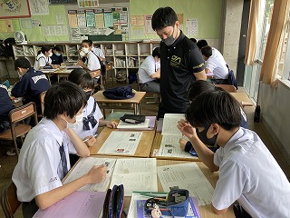 善平先生から「この三角形をもとにして考えて」とヒントが与えられると、ワークシートに補助線を引き始め、解決の糸口にたどりつきますが、終わりのチャイムが鳴ってしまいました。みんながモヤッとしているということは、いろいろ考えた証拠です。一人一人が考え方を説明できるようになるといいですね。これから学習する三平方の定理につながる大切な時間でした!