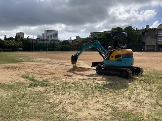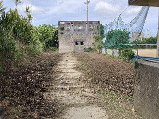 本日午前10時から放課後まで、地域の奥原さん、銘苅さん、座波さんが運動場の砂場、テニスコート横の畑、駐車場の整備をしてくださいました。