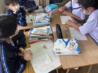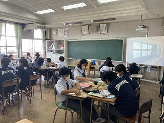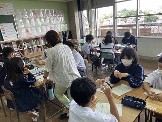 1年3組は金城麻衣先生の国語の授業が行われる予定です。今日は明日の公開授業に向けて、比喩の表現についての各自のアイディアにアドバイスし合うグループ活動の時間でした。