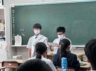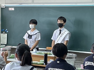 今回は、生徒会長に4名、副会長に2名が立候補しており、それぞれマニフェストを掲げ、ムービーによる呼びかけや今日のように代表推薦者とともに、教室をまわってface to faceで自分のことを知ってもらう選挙活動を行っています。石嶺中の次のリーダーを自分たちで責任を持って選ぶということはとても大切ですね。堂々と演説する様子も、しっかりと聞いてくれている様子もとても頼もしいです。