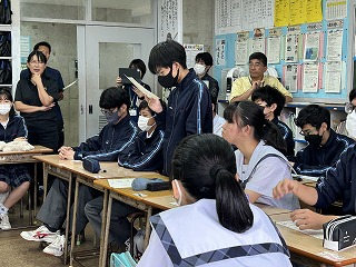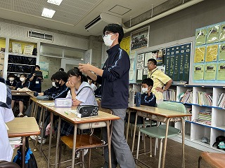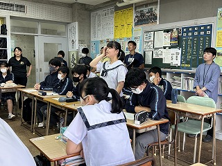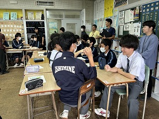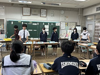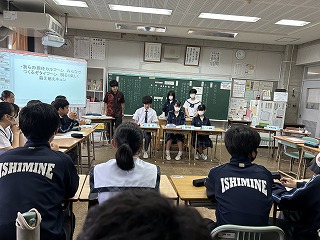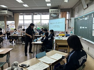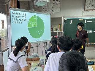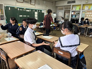 本日2校時、3年1組において長嶺有晃先生の学級活動の研究授業が行われました。「1組の団結力を高めるために学級スローガンを決めよう!」を議題に、学級会を行いました。スムーズに意見を出し合えるよう、アイスブレークで場をなごませています。