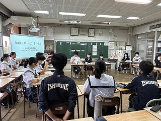 各グループから6つのスローガンのアイディアが提案されています。社会において様々な企業スローガンがあります。有晃先生がそれを基にスライドで話し合いの前の意識付けを行いました。その後6つの案について賛成や反対意見を出していきました。