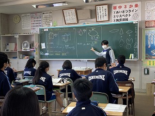 1年生数学では円錐の表面積をどのように求めるか?の授業で、なぜこの式で求められるのか?を逆に自分で説明できるように、丁寧に授業が進められています。社会科では「学年末テスト応援プロジェクト」と題し、どのように勉強すればよいのか、問題を解くときに必要な考え方について事例を挙げてピンポイントで解説していました。何を勉強していいかわからない人はこのプロジェクトのおかげでもういないと思います。