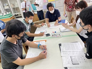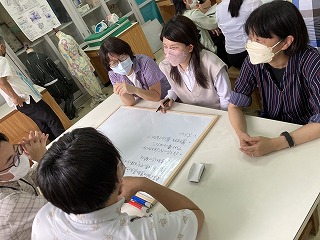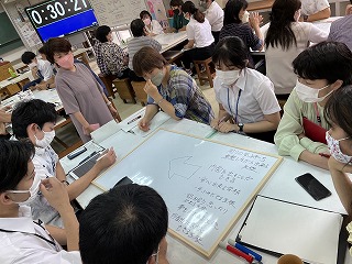 今日の授業で現れた生徒の姿から、どのように学校全体でキャリア教育を仕掛けていけばよいのだろうか?という講師の盛久先生からの投げかけで、さっそくチームに分かれてワークショップが始まりました。