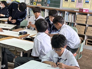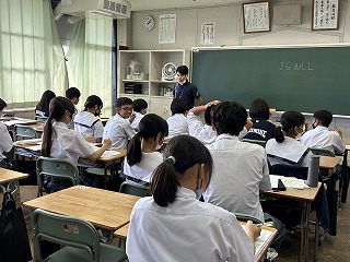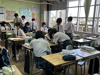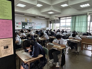 5校時に授業参観をしました。1年1組さん、数学の単元テストの真っ最中でした。そして、1年3組さんはその単元テストが返却されていて、「よっしゃー!」とガッツポーズの人、「惜しい!あと1点~」の悔しそうな人、「満点でした!」と嬉しそうに報告してくれる人、「どうだった?」と見せ合ってる人、みんな自分のテストの点数にちゃんと向き合っていました。模範解答の説明の後、お互いにわからなかった問題を教え合おう!と席を離れて聞き合っていました。