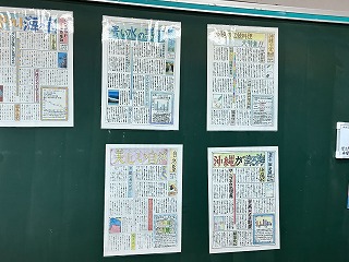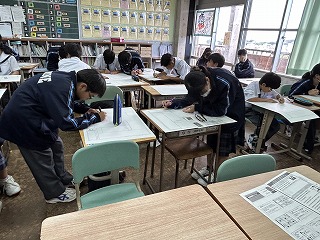1年4組は社会の授業で、夏休みの課題となっている「社会科新聞」の説明を受け、その後新聞用紙の割り付けを行っていました。