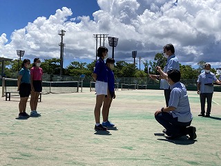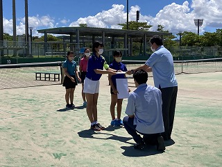桜実・奈海ペア見事優勝し、群馬県で行われる全国大会への切符を手にしました!沖縄県中体連相澤会長より賞状の授与が行われました。2日間5試合を通し、ペアとしてもとても成長していると顧問の豊見山純平先生が話てくれました。全国大会も頑張ってください!