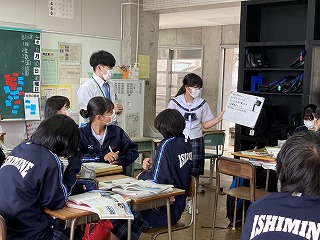 石嶺中の校舎の見取り図をもとに、迷子になったALTの先生に生徒が英語で道案内をする活動でした。生徒はそれぞれの役割を演じながら、音楽室は何階のフロアのどの場所でどう行けばいいのか、校長室の場合は、職員室はなど、場所や役割を変えながら発表しました。
