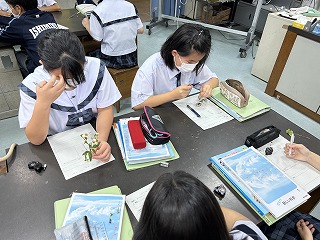 ルーペでのぞきこみながら花や茎の細かなところまで観察して丁寧にスケッチをしていました。