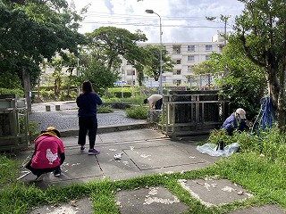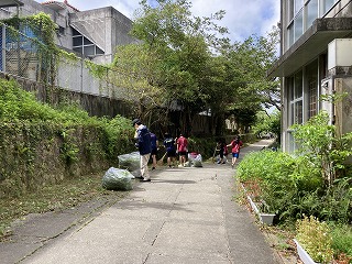 生徒が登校時に通るとぼろち門から体育館横のワルツ通り、石嶺プラザから入ってくるあかぎ門から通路に沿って草刈り作業をしました。刈っても刈ってもまだまだありますが、暑い中みんなで協力して頑張ったおかげで、きれいになっています。