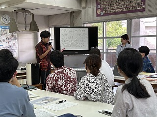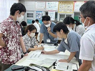 今年度石嶺中学校は「錬心タイム」の改革を行っています。生徒一人一人の探究活動の成果をどのように見取るのか、実際に探究途中の生徒のファイルなどを参考に、どのような力が身につきそうなのか、何ができるのか、できることをどう使うのか、どのように人や社会にアプローチするのかなど議論しながら、実際に評価文を作成するワークショップを行いました。生徒の具体的なテーマと探究の足跡があるからこそ、今日のワークショップは大成功でした。指導と評価の一体化が図られるよう、先生方も頑張っています!