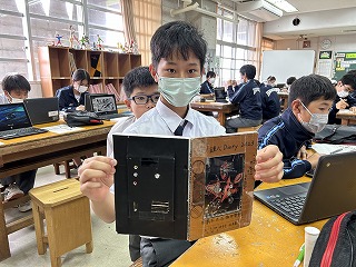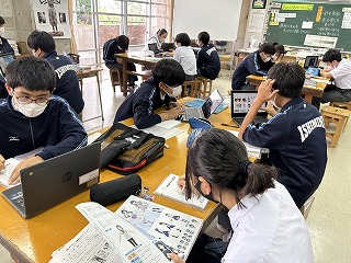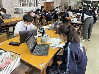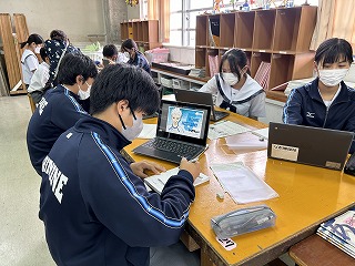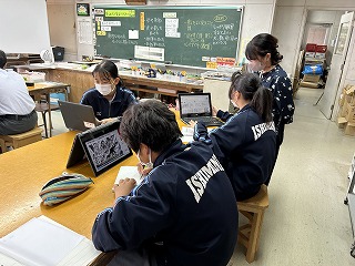 2年3組の美術の時間では、錬心ダイアリーの表紙デザインを行っていました。タブレットを活用し、イラストや画像を検索して参考にしていました。