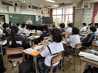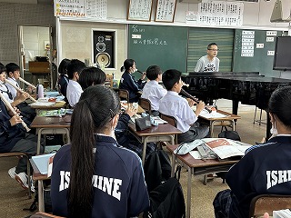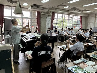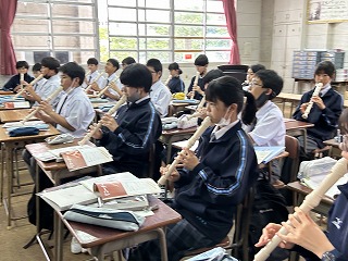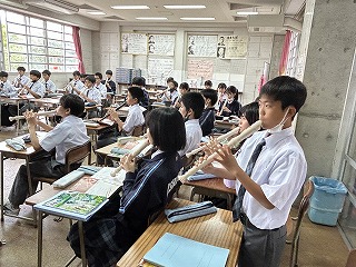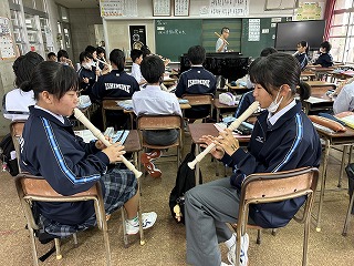 1年5組の音楽の授業では、アルトリコーダーの運指を清秀先生のピアノにあわせて練習していました。1年が終わるころには、きっと素晴らしい音色になるはずです!