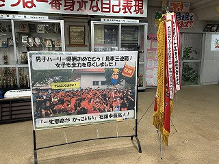 生徒玄関にはハーリー大会の優勝旗が飾られていました。