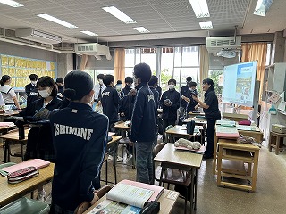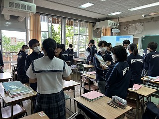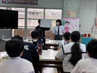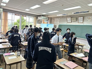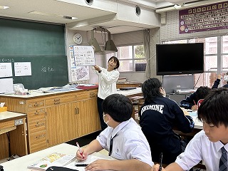 3年5組の英語の授業では、ゴールデンウィークはどうだった?という質問に英語で「ハーリー大会で№.1になって嬉しかった」と答えていました。3年1組の英語の授業ではペアをどんどん交代して会話をしていました。