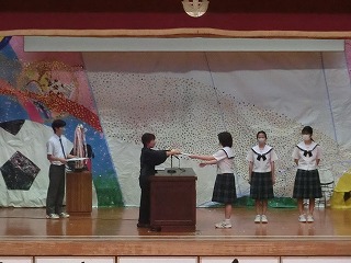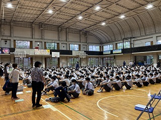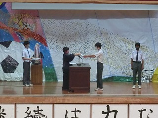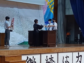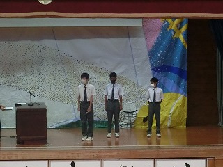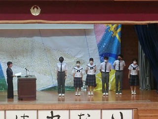 表彰の後、私からは「合唱コンクールの閉会のあいさつで、3年生の本永陽さんが『名門石嶺中学校』と使っていたことを嬉しく思ったこと、石嶺中学校を生徒一人一人が自信と誇りを持って「名門」と呼べる日が来るようみんなで頑張っていきましょう」と伝えることができました。日々の活動を真剣に取り組むこと、一生懸命があたりまえにかっこいいと思える、そんな石嶺中学校にしましょうね!