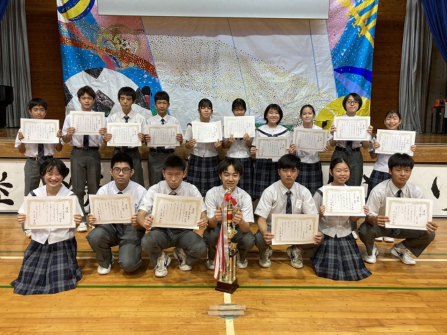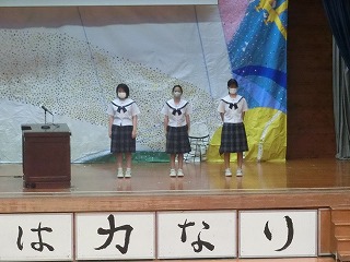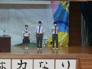今朝は全体朝会で金曜日に行われた合唱コンクールの表彰式を行いました。学級合唱の各学年金・銀・銅賞。各学年指揮者賞、伴奏者賞を表彰した後、グランプリ学級には賞状とトロフィーが授与されました。