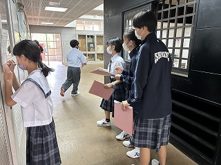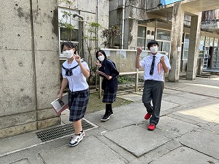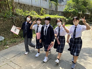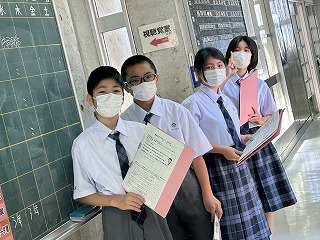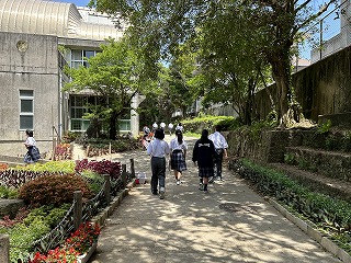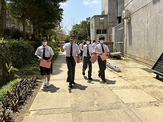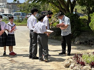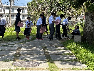 36年という歴史のある石嶺中学校の校舎は少し古くて廊下も狭いですが、空間を上手に使いながら掃除も頑張ってきれいな環境をみんなで作っています。また校庭は緑が多く、年中鳥や虫やカエルの声が聞こえます。校内を探検しながらスタンプを集める1年生の楽しい活動になりました。
