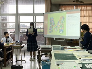 作品から受けた友達の印象と、自分の主題とが、ピッタリ一致したところや、意外だなと思ったことなどをグループで話し合ったのち、全体での発表がありました。飾りたい場所は「家の玄関」「ホテルのロビー」などいろいろです。伝えたかったことは、「出かけるときに元気になれるように」や「モダンで落ち着いた印象」「春のイメージ」など、形は自分のイニシャルをもとにしていますが、配色や表現方法で個性が出ますね。