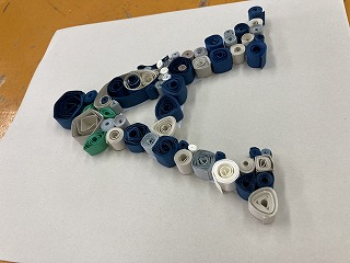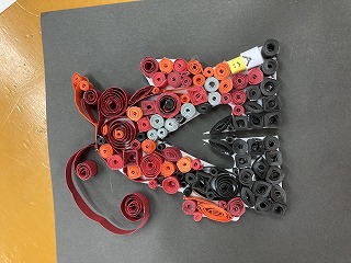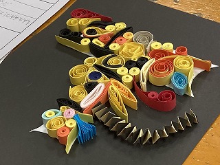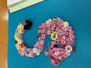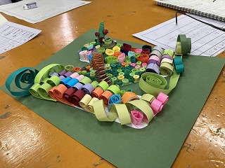 様々な色の画用紙を細長く切ったものを、クルクル丸めたり折ったりしたパーツを主題をもとに配色や配置を考えて、表現する活動「折って・切って・巻いて」の相互鑑賞会の授業でした。