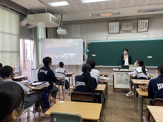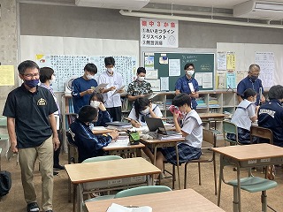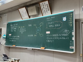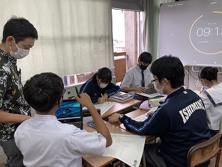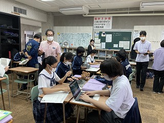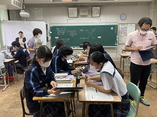 グループになってタブレットを活用し、モノレールの時刻表やおもろまち駅から首里駅までの距離、時速など、必要な材料を分担して集め、グラフに書いてシャッターチャンスの回数を求めていました。身の回りの事柄を数学的にとらえる今日のような授業はとても大切です。いつも元気のある2組さん、先生の言葉一つ一つに反応し、授業のレールから脱線しないように最後まで持ちこたえることができました。ワークシートにどのように考えたか振り返りも書いていました。多くの先生方が参観する研究授業は、生徒の皆さんにもよい刺激になりますね!