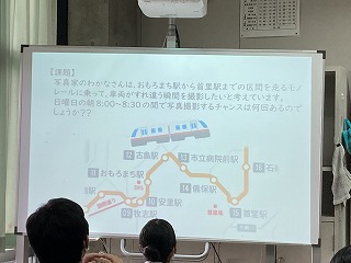導入では自称写真家の若菜先生が、2組の窓から撮った石嶺駅のモノレールの写真を電子黒板に提示しました。「もっと臨場感のある写真を撮るために、モノレールに乗ってすれ違う瞬間を撮影したいけど、一定の時間帯の何がわかったら撮影するチャンスが何回あるかわかるかな?」と問いをなげかけました。