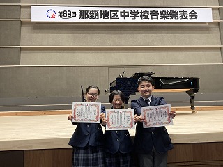 午前の部混声重唱に、本校合唱部の3年生、比嘉清音さん、前川朝愛さん、大城陽汰さんが出場し「三つのマリアの歌より」でその美声を披露しました。ホールに響き渡る3人の歌声がとても美しかったです。