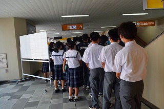 また、午後の学級合唱の部では、後半に本校3年5組が学校代表で出場しました。モノレールで移動しテンション高めでなはーとに到着した5組さんです。