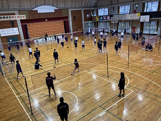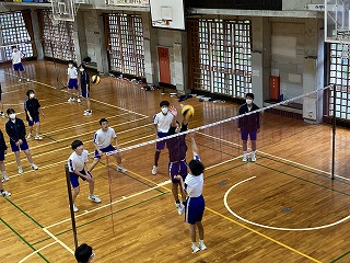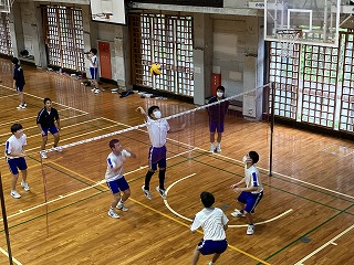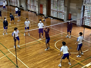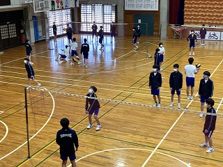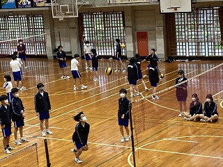 1校時、3年1組、2組、3組は男女混合チームでバレーボールをしています。体育館いっぱいに楽しそうにゲームをしていました。