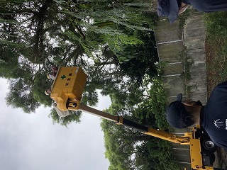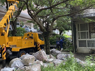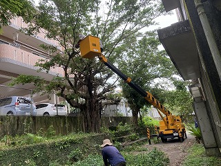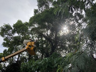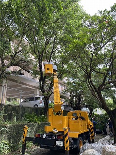 地域の皆さんが高所作業車や、様々な機材を手配してくださり、バスセンター側にはみ出している枝を全部取り除きました。