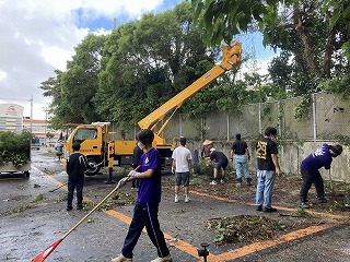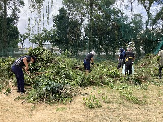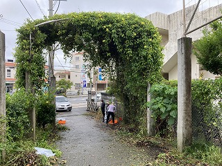 体育館横のワルツ通りも、樹木がうっそうと生い茂って暗くなっていたので、そこもきれいに伐採しました。登校、下校の際に生徒の顔がよく見えるようにと明るくしてくださいました。卒業生も参加してくれて当時の石嶺中学校の話を聞くこともできました。これからの地域の協力者になってくれる頼もしさを感じました。