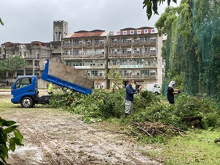 切り出した大きな枝はトラックでグランドに運び、そこで短くカットする作業も大変でした。