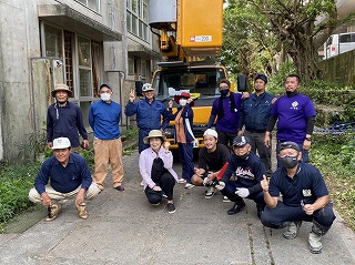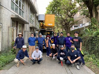 11日(日)9時から、石嶺中学校横のバスセンター側と、グランド側の両方から、大掛かりな伐採作業を行いました。石嶺地域の協力者の皆さん、PTA、青少協、石嶺旗頭保存会の皆さんと昨年成人した卒業生、職員、生徒、総勢30名、ボランティアで一日がかりの作業になりました。