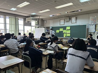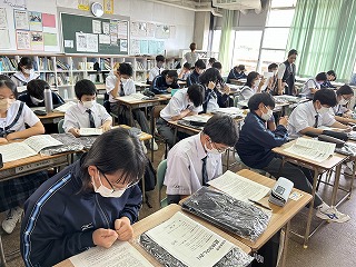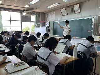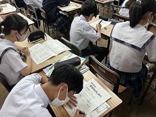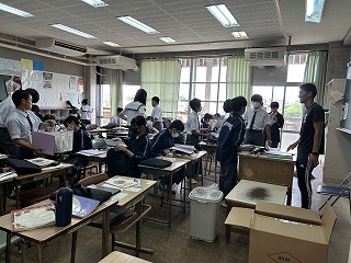 本日6校時の学活は、一学期前半終了の会を持ちました。校内放送を使って、夏休みの過ごし方について確認しました。生徒指導主事の田名先生から、事件や事故に巻き込まれないよう諸注意がありました。また養護教諭の長嶺先生、生徒会の松川先生からお知らせがあり、その後生徒は各クラスで夏休みのしおりに目を通していました。タブレットの持ち帰り、フィールドワークの諸注意、ロッカーの整理整頓、各クラスでの活動を終えて、学活終了となりました。