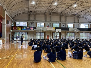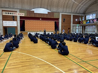 2学年は体育館で集会を行っていました。修学旅行に向けて集団行動についての諸注意を全体で確認しています。ピリッとした緊張感がありました。3学年は卒業アルバムの顔写真撮影を行っていました。あんまりじっと見つめると恥ずかしそうなので、そっと様子をうかがいました。