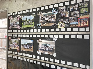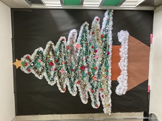 黒い色画用紙に四角い白のシールを並べてはると、ネガフィルムのようです。それにクラスの思い出のアルバムが飾られています。成長の様子がわかるナイスアイディア!そして1組の廊下の突き当りはそこだけまるで別世界!クリスマスシーズンですね!このツリーの前で記念撮影をするそうです。私も撮りたいと思いました!
