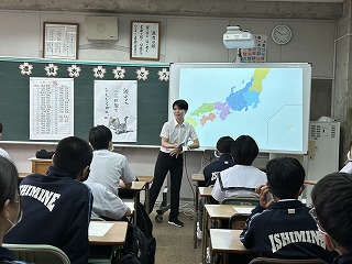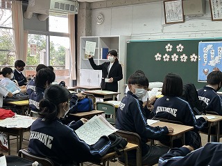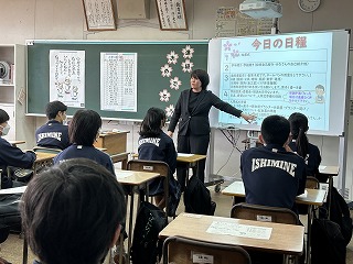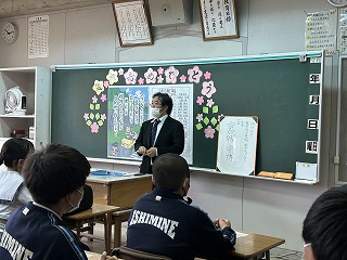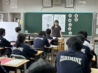 2学年、3学年ともに学年主任によるアイスブレイクで場の空気をなごませた後、3学年では3種類の大きさの異なるくす玉を割って進級を祝いました。2学年は「いしみねちゅうがっこう」の一文字ずつで職員の自己紹介をして、最後は「打つ手は無限」の群読をしました。