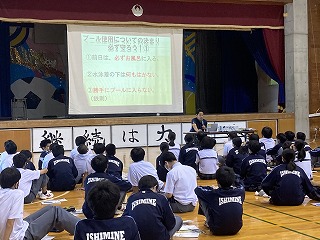 2年1組・2組・3組の体育では、明日から始まる水泳の授業のオリエンテーションを行いました。きまりを守って安全で楽しい授業にしてほしいです。