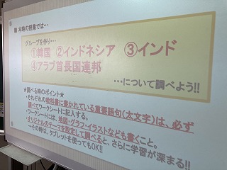 1年4組さんの社会科の授業では、グループでインターネットを活用して韓国やインド、インドネシア、アラブ首長国連邦などの国の特徴を分担して調べていました。