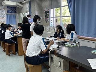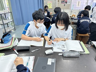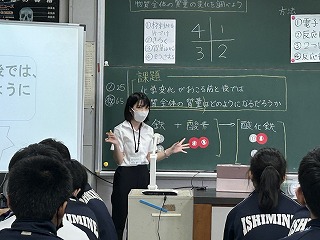 昨日、2年3組で実習生の伊志嶺綺子先生による研究授業が行われました。「化学変化が起こる前と後では、物質全体の質量はどのようになるのだろうか?」という課題をもとに、3組さんはグループで予想を立てていました。