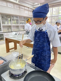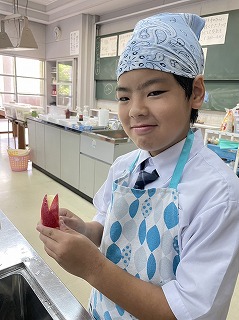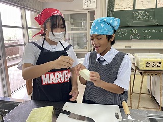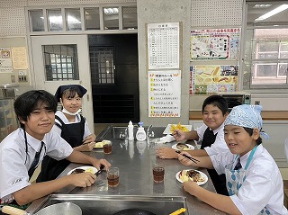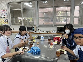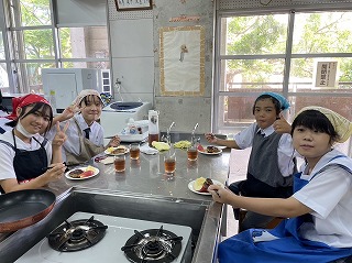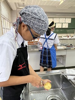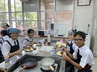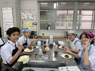 うさぎリンゴの実技試験と合わせて実施されました。昨日の1年3組の様子です。写真提供は学年主任の麻衣先生でした。仲の良い3組さん、調理実習でもしっかり協力して美味しいハンバーグに仕上がったようでした!