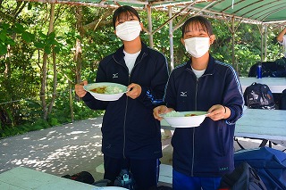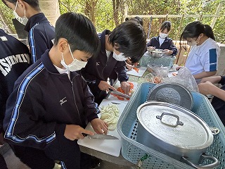 場所が少し狭くて作業するのが大変そうです。火加減を調節するのも一苦労、「目が痛い~」と言いながら頑張っています。家でも料理を手伝っているのでしょうか、包丁を上手に使っている生徒もいました。そして人参はとても小さく切っているのがかわいいです。