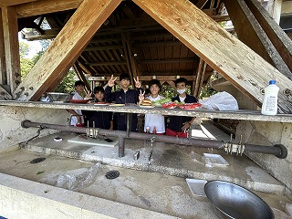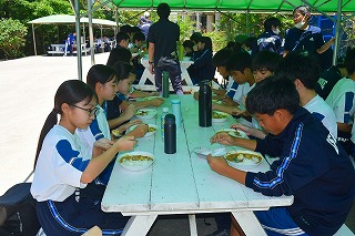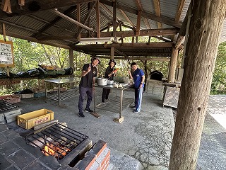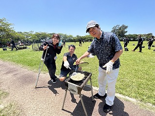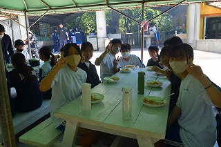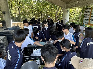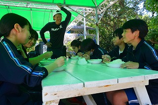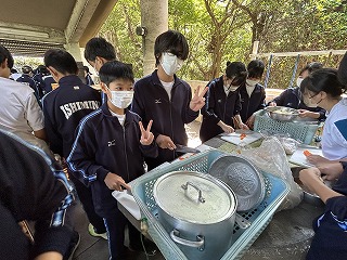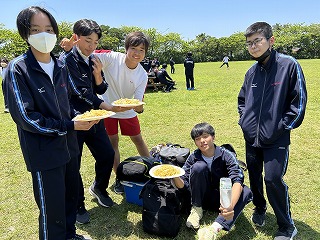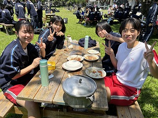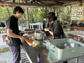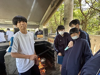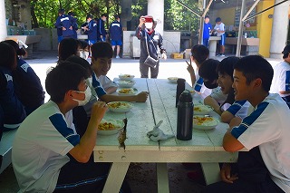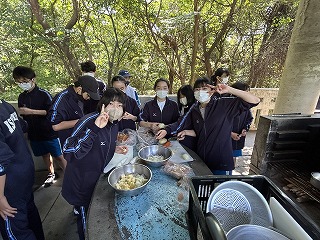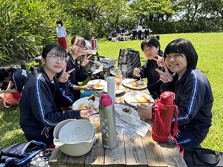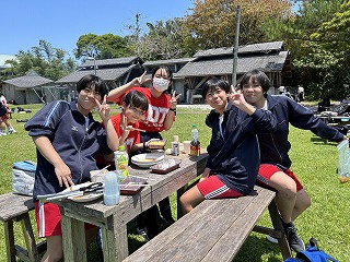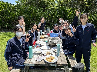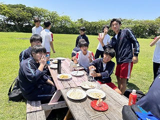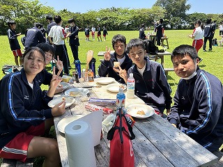 3年生の料理対決に間に合うか!と糸満まで移動しました。残念なことにほとんどのグループが出来上がった自慢の料理でランチパーティーの真っ最中でした!!!仲良く作っているところに間に合いませんでしたが、何を作ったか聞いてみると、「焼肉」「カルボナーラ」「ペペロンチーノ」「肉じゃが」「ピザ」「フライドポテト」「ハンバーガー」「オムライス」「チョコフォンデュ」ほんとにありとあらゆるメニューに挑戦したようです。家からきゅうりの浅漬けを作って持ってきているグループもありました。みんな味は最高!と言うだけあって、少し味見をさせてもらいました。みんな美味しかったです!!!先生チームは餃子に挑戦していました。デザートのイチゴやバナナも餃子の皮に乗せてクリームトッピングをして楽しんでいます。この後、レクを予定しているとのこと。どの学年もみんな楽しそうに仲間づくり、学級づくりの活動につながっていました。楽しい思い出が一つ増えましたね!気を付けて帰ってきてください!!!
