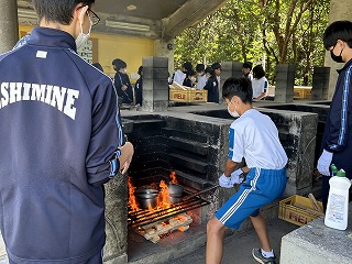 2年生の様子を見に行くと、ちょうどグループごとに火をおこす、米をとぐ、野菜を切るの役割分担でカレー作りの真っ最中でした。