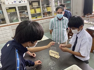 グループで金属と非金属の性質を考えて、それぞれの共通点や相違点を確認するためにどんな実験をしたらよいか予測を立てさせていました。電流が流れるのか、磁石にくっつくのか、たたくとのびるのか、塩酸を加えるととけるのか、一気に実験が始まりました。