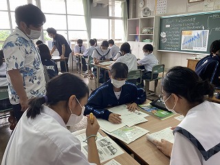 その後、席を交代しながらメリット側の意見、デメリット側の意見を共有し、生徒からの言葉をつないでまとめを行っていました。
