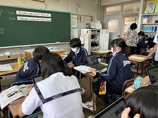 昨日6校時、3年1組で具志堅千恵子先生の英語の授業が行われました。教科書に出てくるアヤさんがまとめた新聞の内容を読み取り、印象に残ったことや感想を書く活動でした。