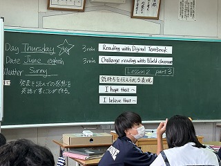 1組さんは参観者が多い授業で、リーディング場面では控えめでしたが、一人ひとり声に出して頑張っていました。タブレットでワールドクラスルームを活用することで、自分の発音のどこが惜しかったのか、単語が赤色になるため、視覚的に再チャレンジしようとする姿がありました。テーマが野生のワシと環境問題を取り上げている記事で、感想を英語で書くのですが、どの文章がより印象に残っているのか、どこを引用して書くのかを1組さんは考えていました。千恵子先生の一生懸命語りかける姿を見て、授業を通して鍛えられていくのが教育実習だなと、改めて実感しました。実習もあと2日です。頑張ってくださいね!