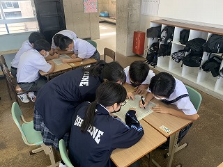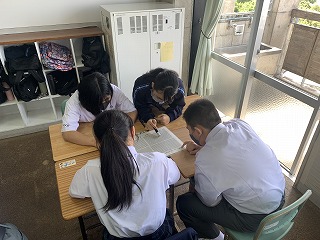 新司先生が、単純だけどチームで協力しないと解決できない問題を出していました。自然とみんなの頭が近くなって、一生懸命解いています。新学期の新しいメンバーで、いろいろな活動を通して、少しずつ関係性が育まれていくのはとても大切です。特に環境が変わった一年生はなおさらですね。私が通りかかったら、「みんな、校長先生がホームページにアップしてくれるはずよ!」と言われ、1組さんの目がキラキラしたので、忘れずにちゃんとアップしましたよ!